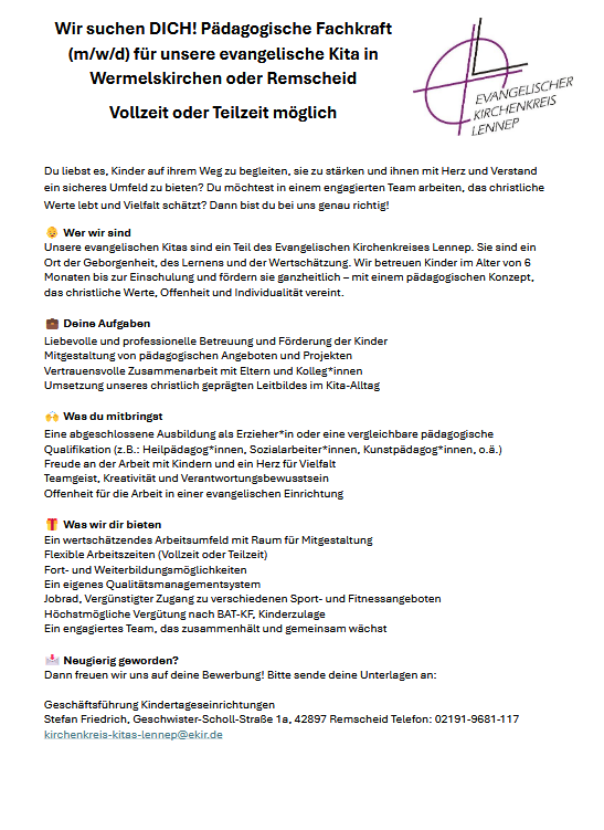 Ihre vollständige Bewerbungen ( Motivationsschreiben, Lebenslauf, Zeugnisse und mögliche Teilnahmen an Fortbildungen) senden Sie entweder an email@oefz-luettringhausen.de oder direkt an die E-Mail Adressen unserer Kitas.